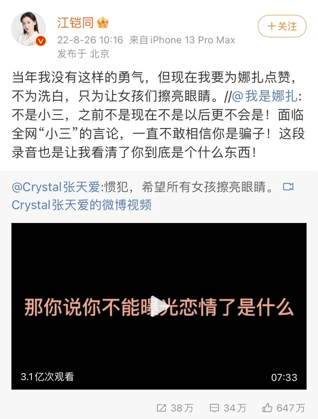 但没想到的是,这场闹剧在娜扎这里开始了分支,起因是江铠同转发娜扎微博,说“不为洗白,只为让女孩们擦亮眼睛”。
