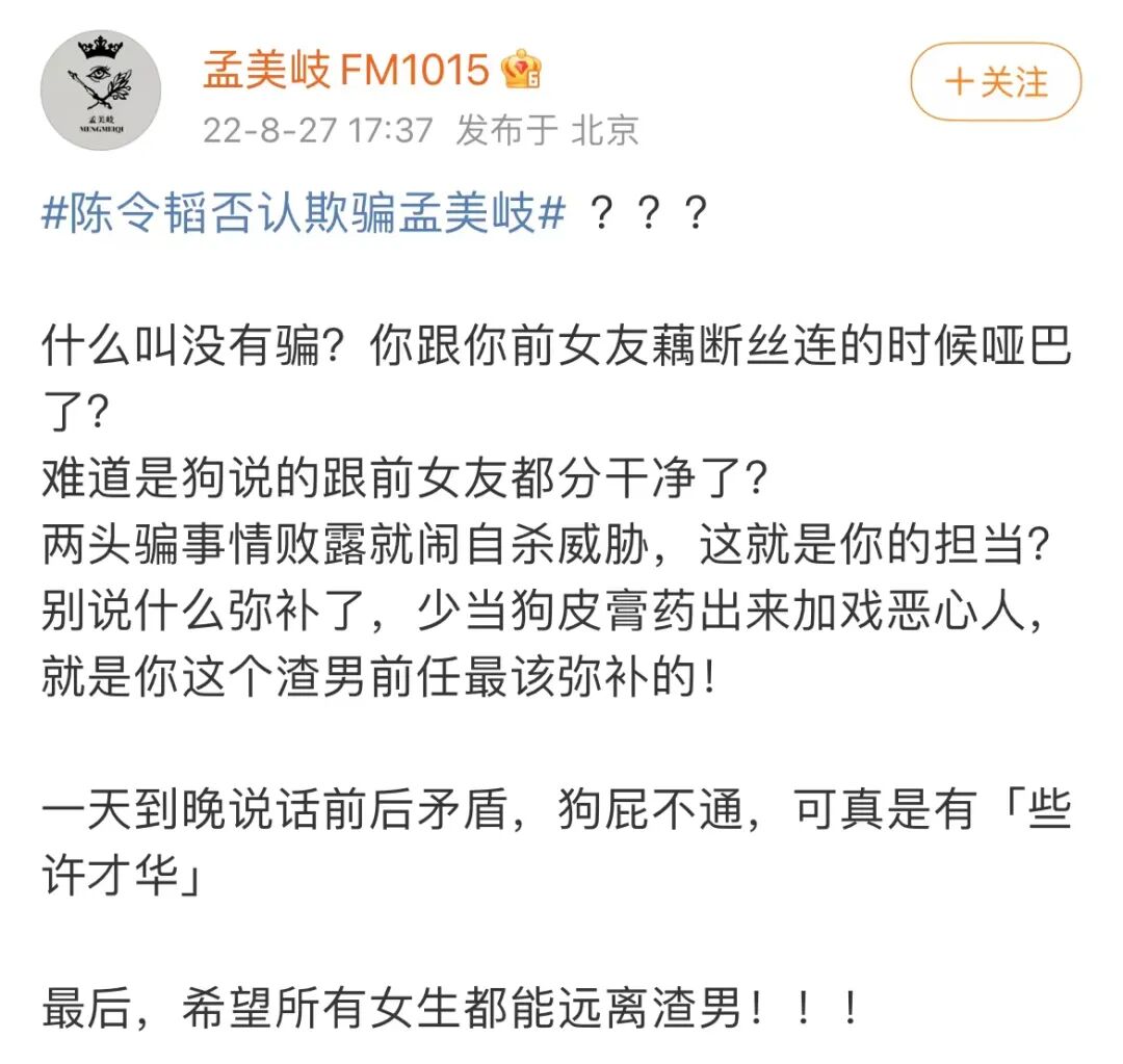 孟美岐这边迅速接招,工作室直接带话题开怼:陈令韬一边跟前女友藕断丝连,一边欺瞒孟美岐已经分手,两头骗暴露了之后闹自杀威胁,这就是你的担当?