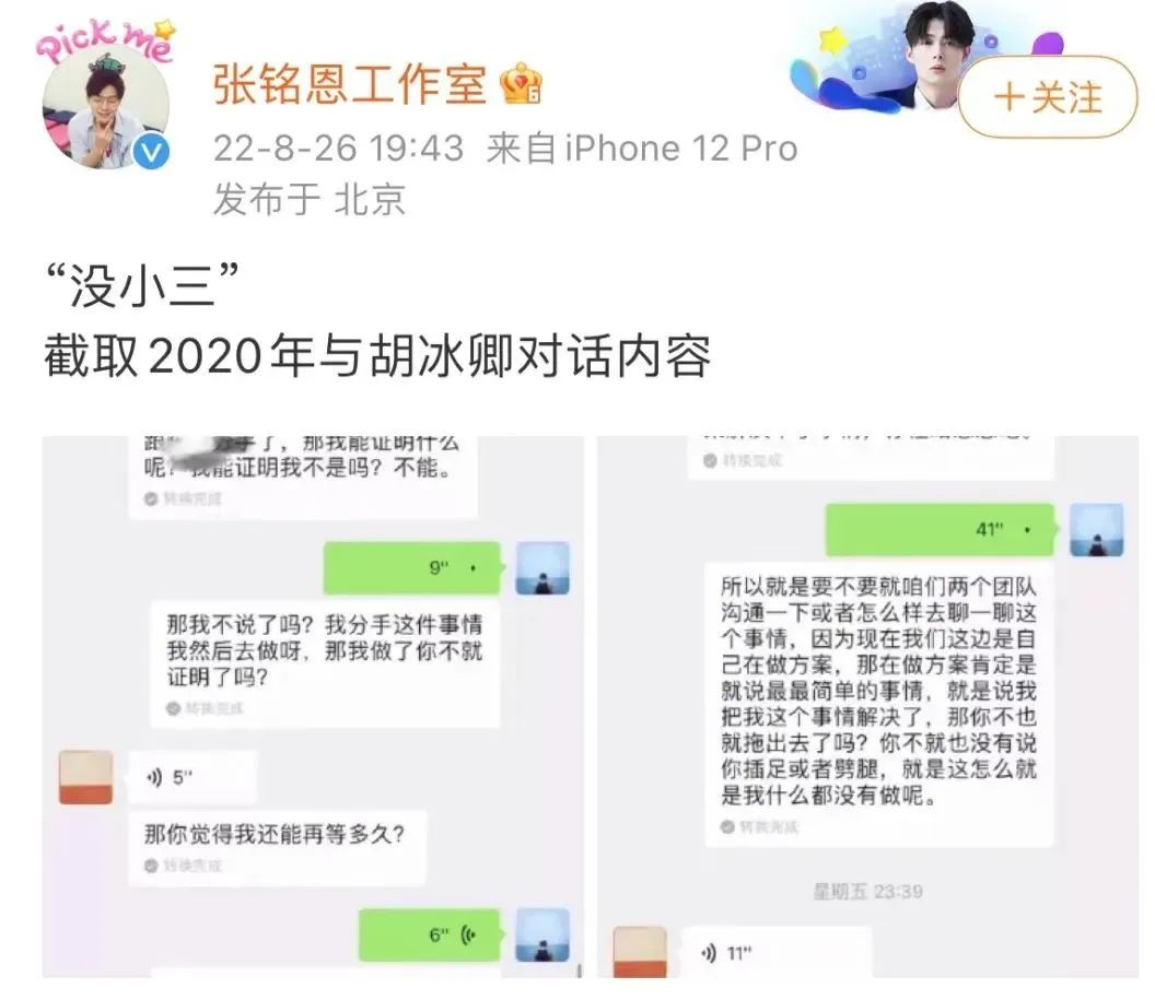 26 号傍晚,张铭恩工作室发出了两组聊天记录截图,否认张铭恩和徐璐、胡冰卿三人感情纠葛中存在“小三”、“出轨”。