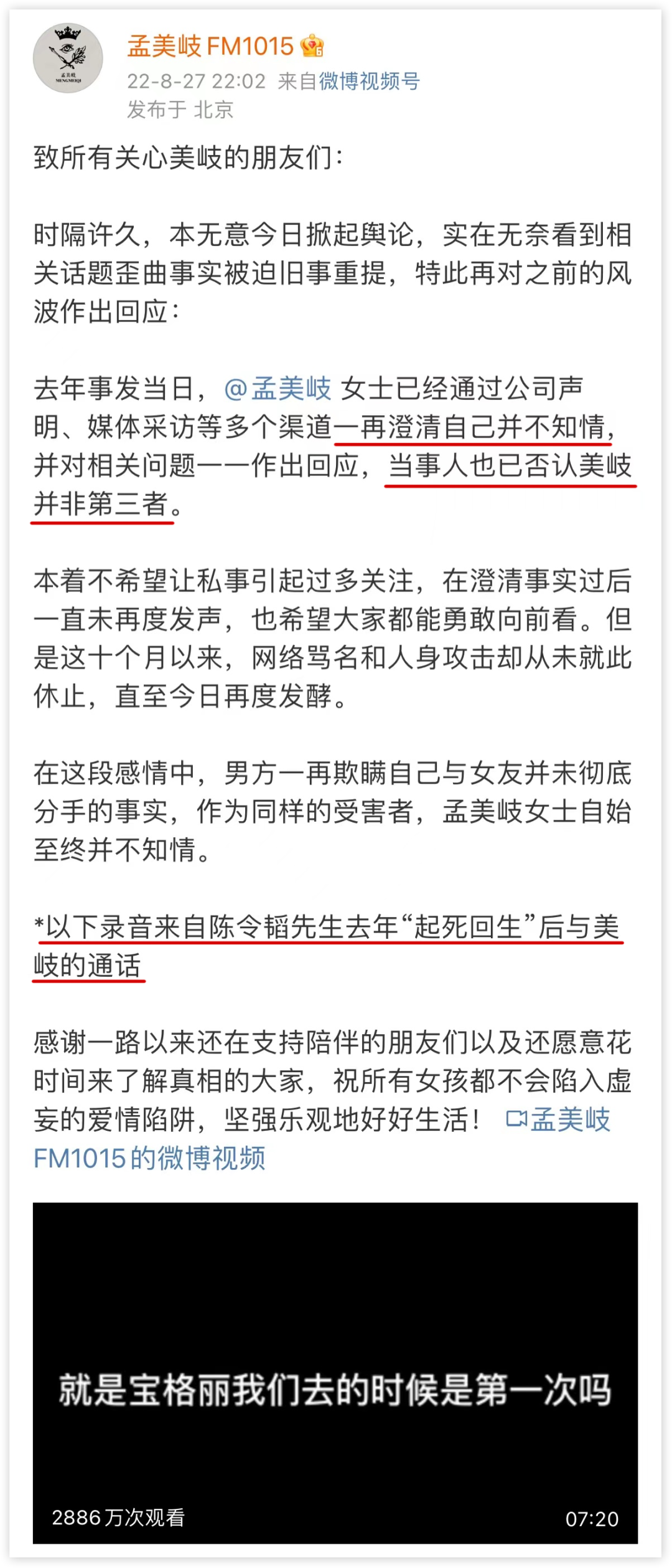 孟美岐这边紧接着放出了一段一年前和陈令韬的录音,强调自己当初的确并不知情。