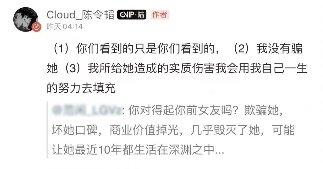 27 日凌晨,陈令韬在网易云回复网友,说自己没有骗前女友(孟美岐)。而“我给她造成的实质伤害,我会用我自己一生的努力去填充。”