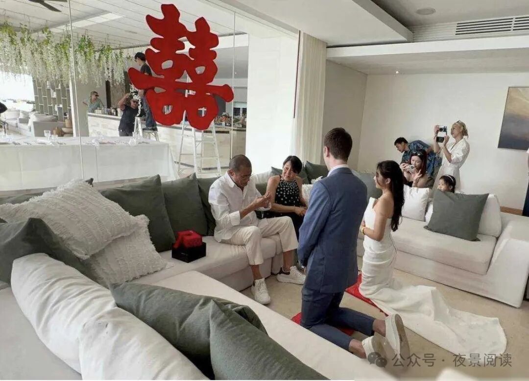 说到婚礼现场,那可是大有文章。梁静曦的婚礼确实不像姐姐那样豪华,极致浪漫,但它还是值得纪念的。这次婚礼在室外举行,简约而别致。一对新人,女孩子身披洁白的婚纱,男孩子身穿笔挺的西服,他们没有选择穿中式的裙褂,但中国人的礼仪并不会少。梁家辉和太太在贴着喜庆的红纸上端坐着,笑意盈盈地看着眼前的新人们敬茶。如诗如画的场景,让人不由得感慨爱情的美好。