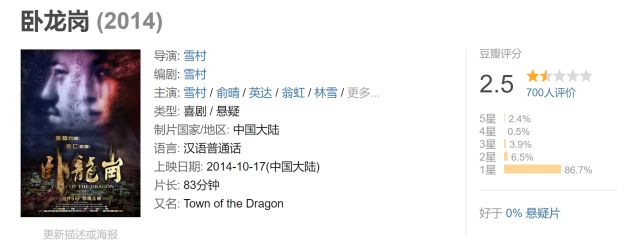 在这之后,雪村也演了几部电视剧但都不怎么出名。沉默了很长一段时间的雪村,在2014年自编自导自演了一部网络电影《卧龙岗》。没想到这部《卧龙岗》遭到了他粉丝们的炮轰——豆瓣2.5分。