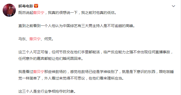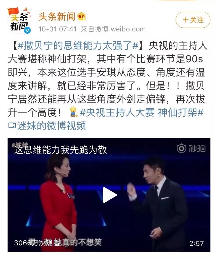 而在今年的《主持人大赛》中,让他上热搜的那一段主持,更是充分体现了撒贝宁的思维深度。