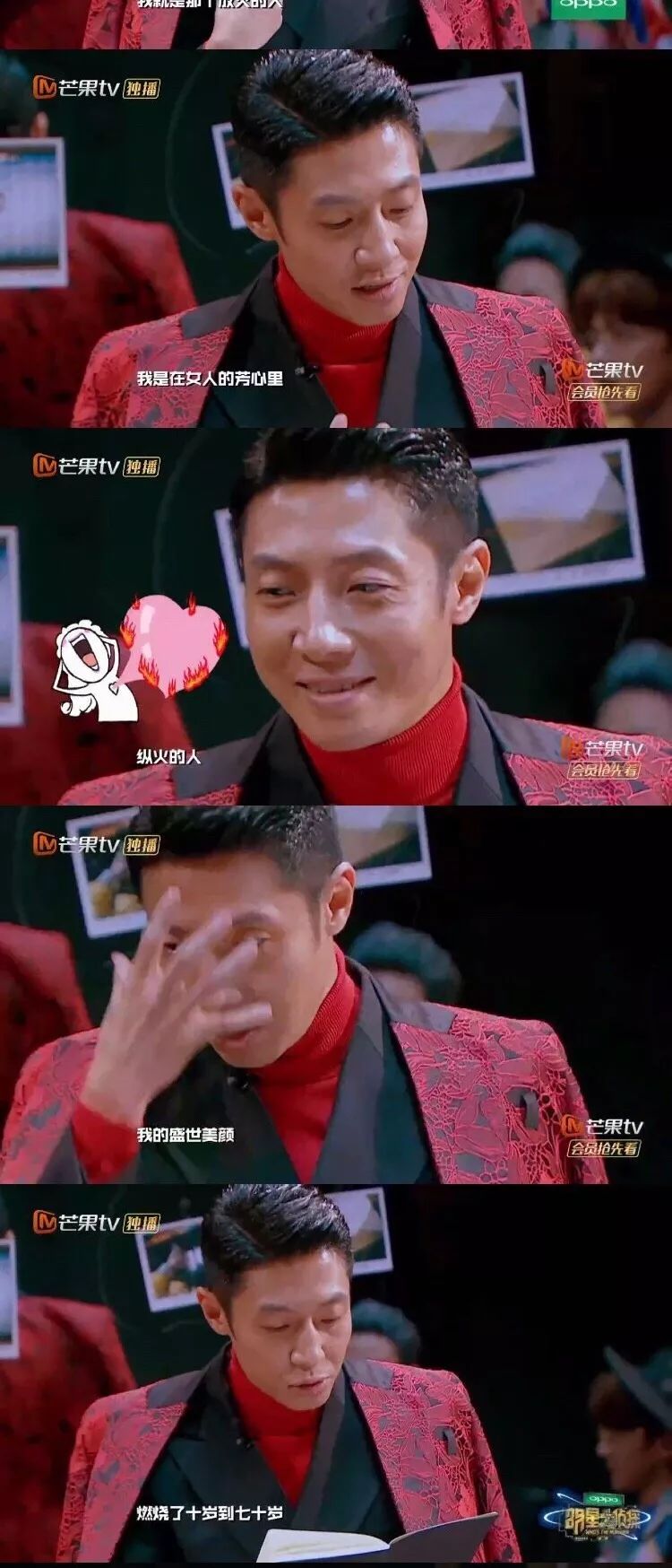 当时他角色扮演娱乐圈里一位著名天王,备受追捧,迷妹无数,所以他念独白时,说自己是在“女人的芳心里,纵火的人”。