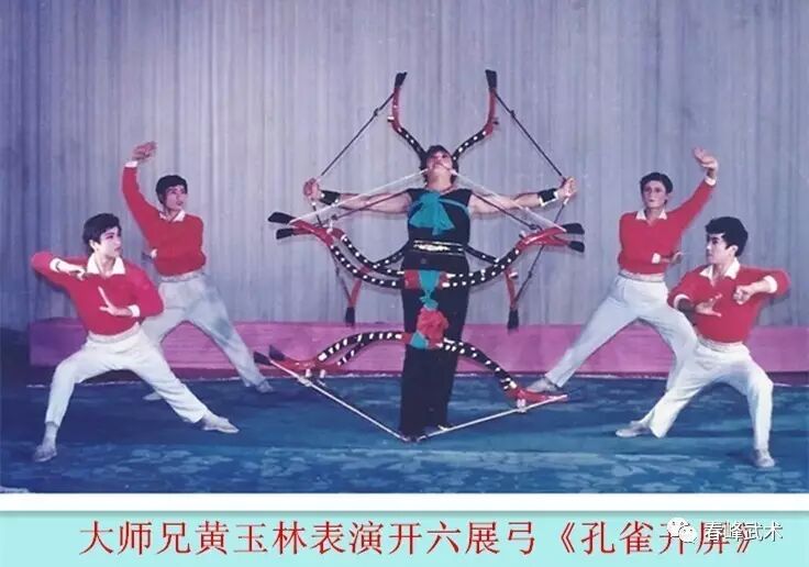 黄英拉弓,名震遐迩。凡见者,无不竖指称道,一张弓,拉力百又八十斤,六张弓已逾千斤也,而黄英却能成孔雀开屏式,同时拉圆六张弓!无怪当年,周总理看了他的表演,会握着他的手,称他是老英雄。这是摘录1985年《当代体育》第3期杂志里一段。
