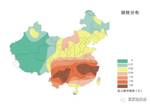 胡姓在人群中分布频率示意图表明:在长江流域的云黔渝鄂湘赣浙沪八省市、四川大部、皖苏南部、福建大部、粤桂北部,胡姓占当地人口的比例一般在1.24%以上,中心地区可达近3%,这部分面积仅覆盖了总国土面积的16.4%,而居住了大约60%的胡姓人群。在粤桂闽南部、台湾、海南、青海湖以东吉林以南的其他北方地区,胡姓占当地人口的比例在0.62%—1.24%之间,其覆盖面积占了总国土面积的32.3%,居住了大约37%的胡姓人群。