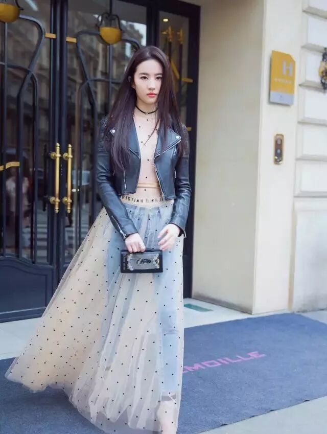 皮衣、纱裙、牛仔裤三种完全不一样的元素搭配在一起却有一种和谐的好看,裙子里面穿裤子是今年很流行的穿法。