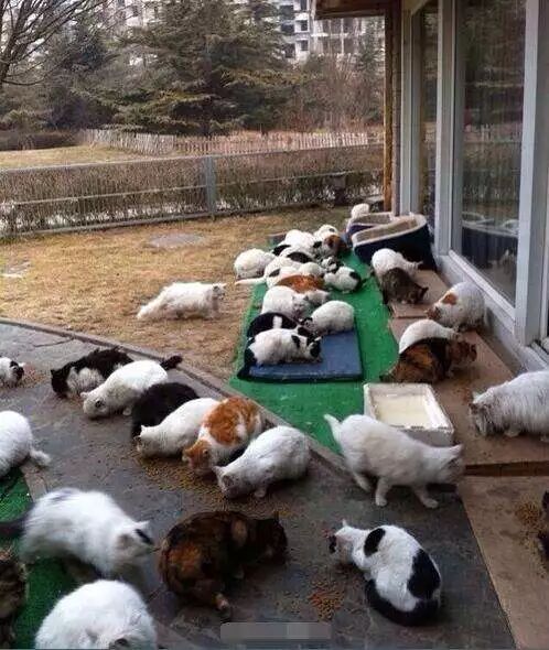刘亦菲的后院,也不算多华丽,却是一群被喂得圆滚滚的流浪猫,原来刘亦菲母女在自家的后院救助了很多流浪猫。