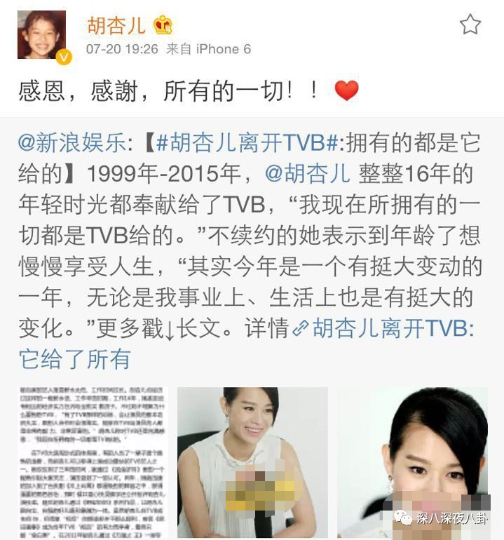 其实吧,当年胡杏儿离巢并没有想象中那么狗血,走的时候她还发文感谢TVB,表示现在所拥有的一切都是TVB给的