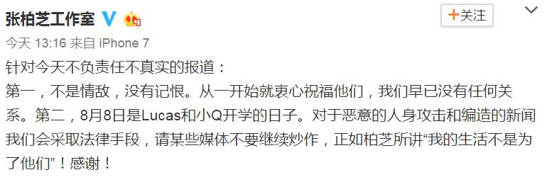张柏芝工作室今天下午也做出了澄清:从来就不是情敌,哪里有什么记恨!!