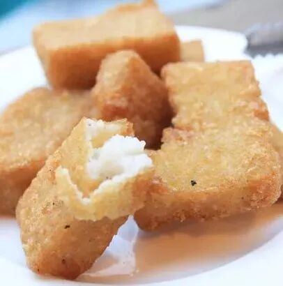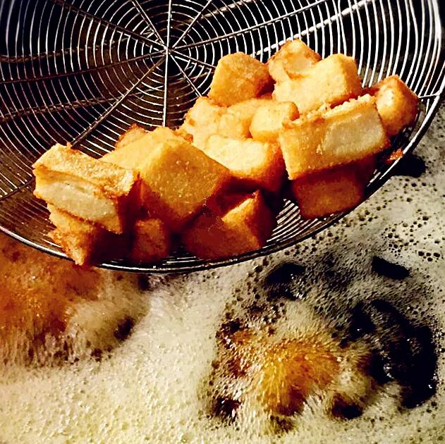将菜粿粗坯切成块,油炸至双面金黄。