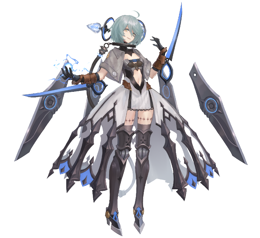 化为“幻书”的弗兰肯斯坦从外形上贯彻了“科学造物”的特征。以黑白、银灰、钴蓝为主的色彩搭配,营造了冰冷沉重的机械感;贯穿于头部的金属零件,环绕全身的蓝色电流,揭示了她“非人”的身份;而手臂、身后随处可见的锋利刀刃,也暗示着她对“非我”之外生物的警惕与防备。除去这些机械装置,弗兰肯斯坦似乎也只是个普通的可爱女孩,但她身上那些隐隐现出的缝合痕迹,正如她饱含自卑与恐惧的内心一般,无法掩饰。升格后,弗兰肯斯坦身上的装备同步进行了升级,从视觉上更具现代科技感,灯管与萦绕的电流激发了她“非人”的灵智,笑容也更显真诚。也许同伴的加入,能让弗兰肯斯坦在无法辩驳明暗的幻书世界里,避免原著已有的悲剧。