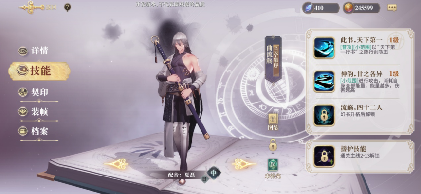 除了外貌形象以外,《幻书启世录》还加入了全新的“书界”概念,进一步完善游戏“书拟人”的设定。“书界”来源于幻书的书籍原型,是游戏拟人形象的精神层面表现,依据书中原有的文字和思想,作为幻书的技能来源。比如上文中提到的曲流觞,他的原型《兰亭集序》有“天下第一行书”之称,其书界也与“书法”息息相关。