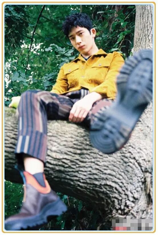 井柏然穿着一件姜黄色的外套坐在树枝上,像是一个单纯的小男孩,羞涩稚嫩,干干净净的十分的鲜嫩呢,搭配着一条细纹裤子和马丁靴也十分的洋气。