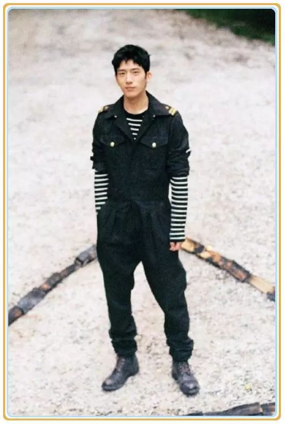 井柏然穿着一件黑色的工装连体装,内搭一件黑白条纹的T恤,脚上一双黑色的马丁靴,一身黑的感觉给人一种严肃冷酷的感觉,但是袖子上的黑白条纹有给人一种阳光大男孩的感觉。