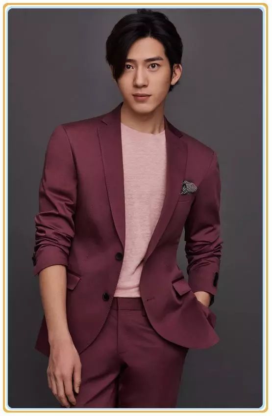 井柏然穿着一件棕红色的西装,优雅大气十分的迷人,精致的西装给人一种英国绅士的感觉,内搭一件粉色的T恤也是很别致呢。