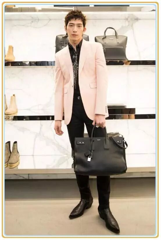 井柏然穿着一件粉色的西装外套,内搭一件黑色的衬衫,黑裤子加尖头皮鞋,这一看就是走时尚路线的嘛!手里拎着黑色的大包也是够fashion。