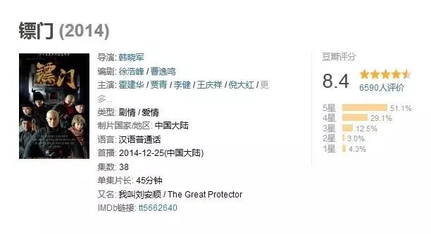 这剧是清末民初年代剧,讲的是走镖的故事。按理走镖应该基情满满、跌宕起伏,奈何宣传期不炒恋情,也借不上热门IP,2014年年末开播,就与“火”无缘了,后续几轮更是平淡。