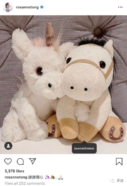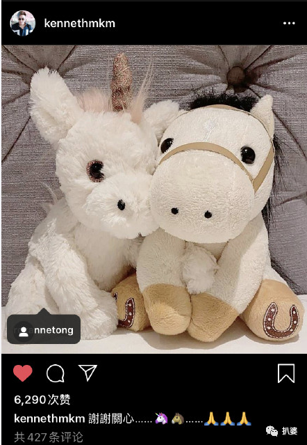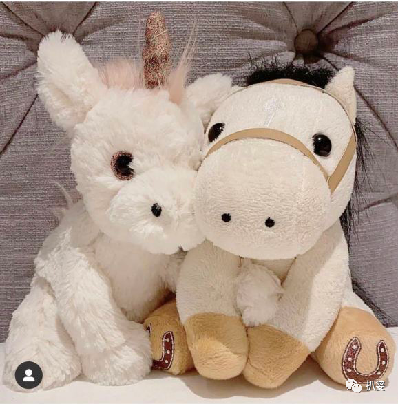 没晒合影,晒的是一对独角兽用胳膊挽着小马的公仔。