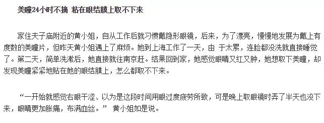 5.美瞳每天佩戴时间建议不要超过8小时。睡觉千万记得摘下美瞳!!曾经就有人24小时不摘,美瞳粘在眼结膜上取不下来。