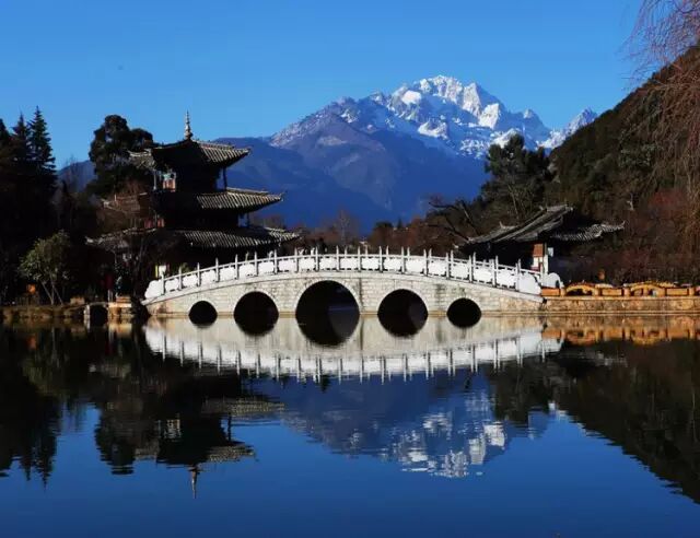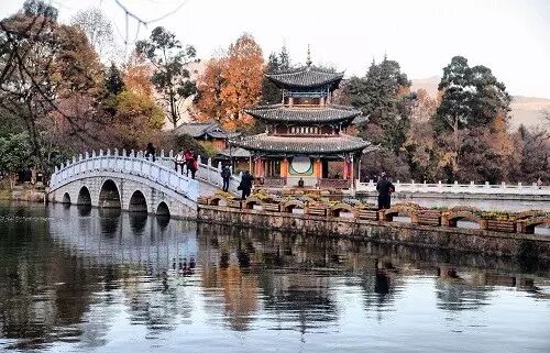 位于丽江古城北象山脚下,从丽江古城四方街沿经纬纵横的玉河溯流而上,约行一公里有一处晶莹清澈的泉潭,即为中外闻名的黑龙潭。潭水从石缝间涌涌喷出,依山斛清泉汇成四万平方米潭面。四周山清水秀,柳暗花明,更令人称奇的是玉龙雪山正好倒映在黑龙潭水面上,清澈的湖水倒映着玉龙的巍峨,这个画面曾经作为丽江的标志为很多人所熟悉。相传在很久以前,有十条蛟龙常作恶于人间,吕洞宾收服了其中的九条,镇压在市区拓东古幢(即古塔)之下,留下一条小黑龙住在这里,要其为民谋利。黑龙潭便由此而得名。
