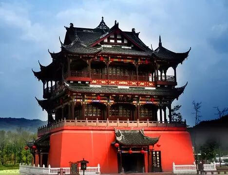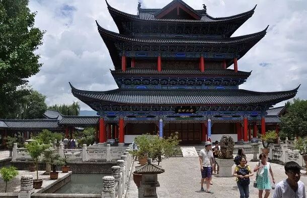 五凤楼,原名法云间,是位于丽江市黑龙潭公园北端的一个历史建筑。五凤楼始建于明万历二十九年(1601),1983年被公布为云南省重点文物保护单位。楼高20米,为层甍三重担结构,基呈亚字形,楼台三叠,屋担八角,三层共24个飞檐,就象五只彩凤展翅来仪,故名五凤楼。全楼共有32棵柱子落地,其中四棵中柱各高12米,柱上部分用斗架手法建成,楼尖贴金实顶。天花板上绘有太极图、飞天神王、龙凤呈祥等图案,线条流畅,色彩绚丽,具有汉、藏、纳西等民族的建筑艺术风格,是中国古代建筑中稀世珍宝和典型范例。