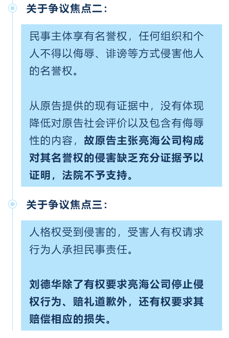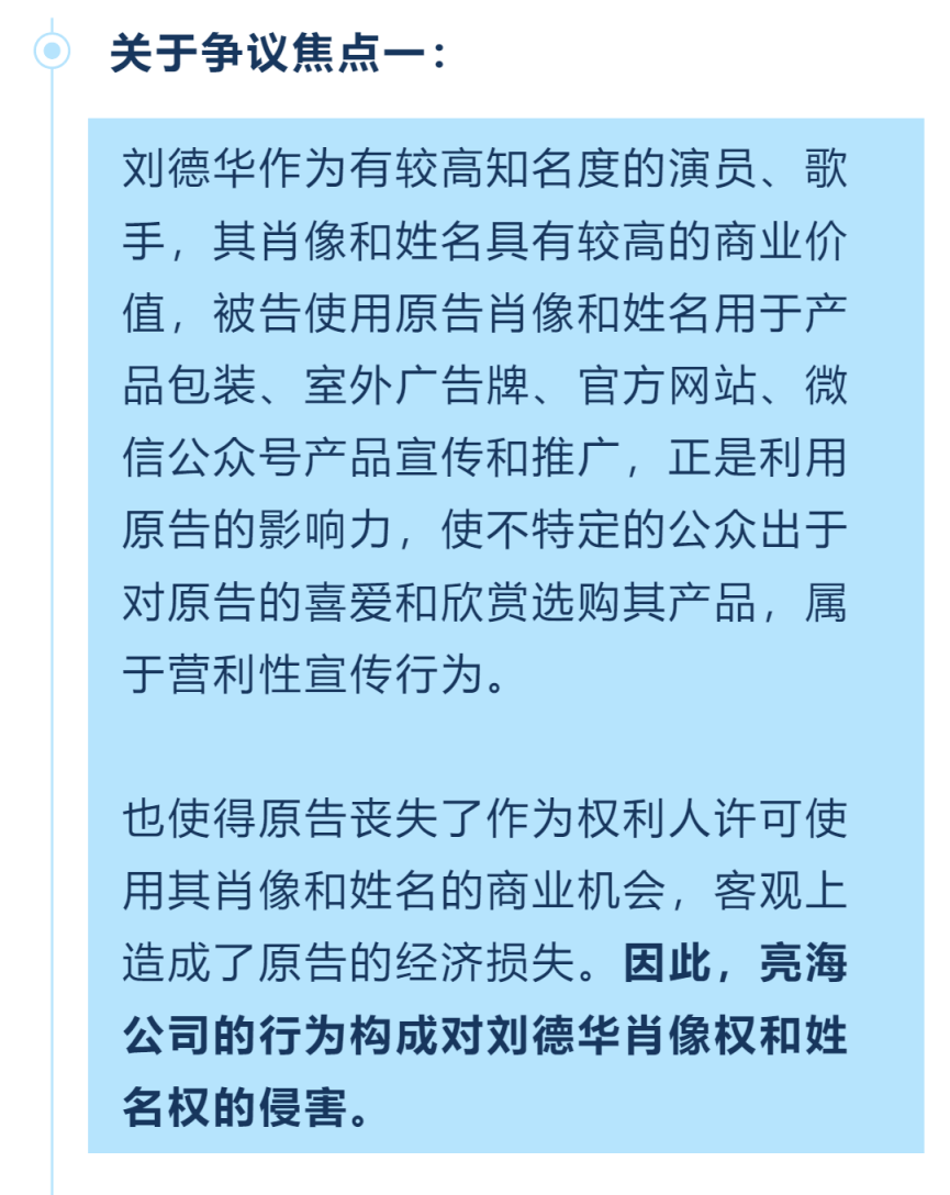 刘德华及其经纪公司多次要求停止侵权行为一直未果,遂以侵犯肖像权、姓名权、名誉权为由将亮海公司告上法庭。