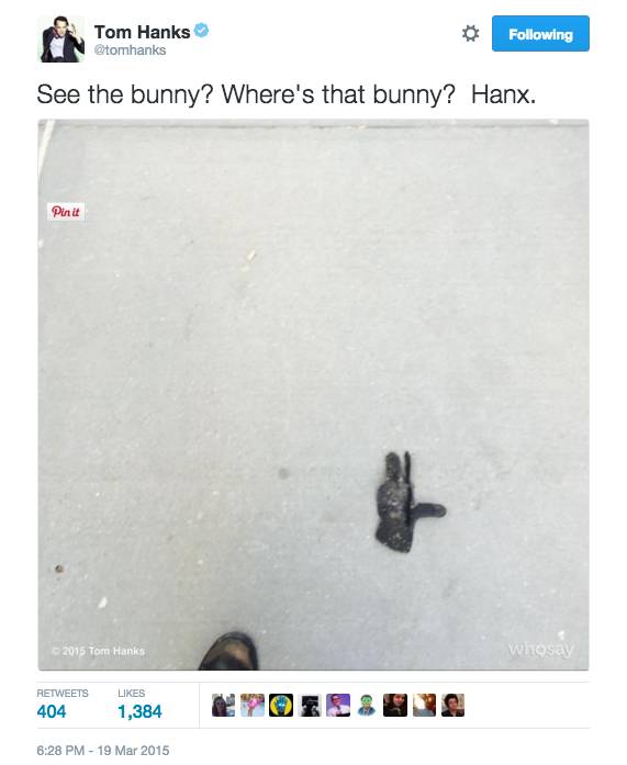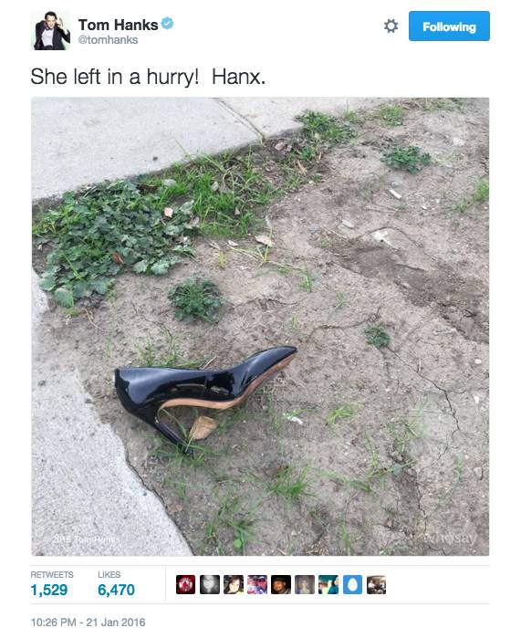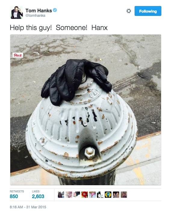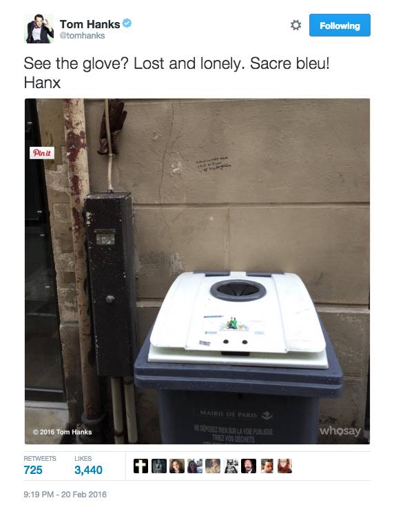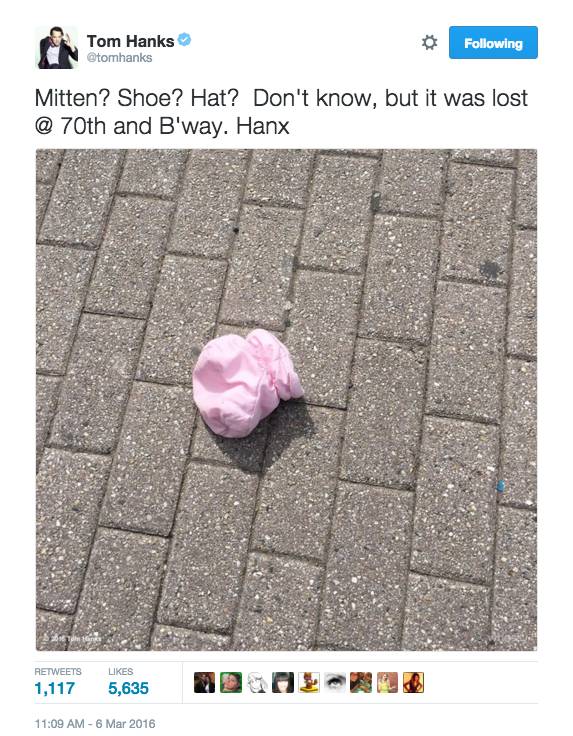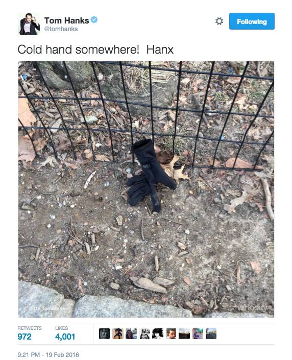 例如他发现角落里有一只手套,他就会照下来发推说。。