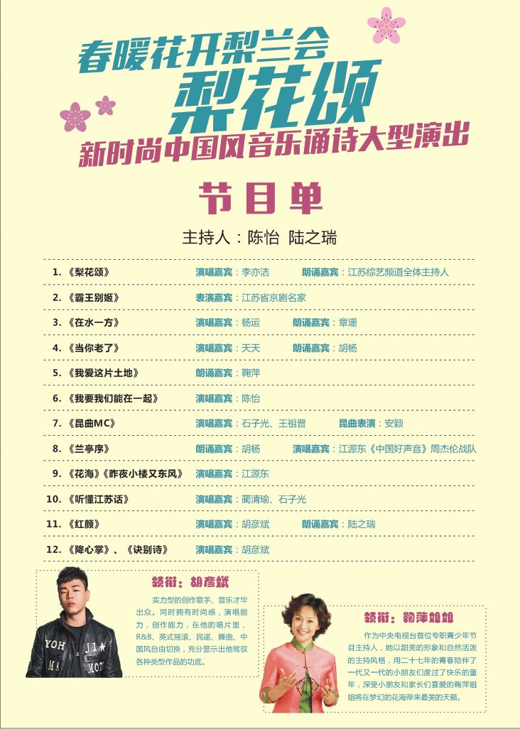 作为全年“星期六绿色音乐会”的首场演出,同时也作为春季梨兰会的启动仪式,集团将联合江苏省戏剧家协会,邀请十余位梅花奖获得者,举办大型综艺晚会《咏梅》。演出以梅花为主题,以舞蹈、戏曲、杂技、相声等多种艺术形式,彰显民族艺术的独特魅力。