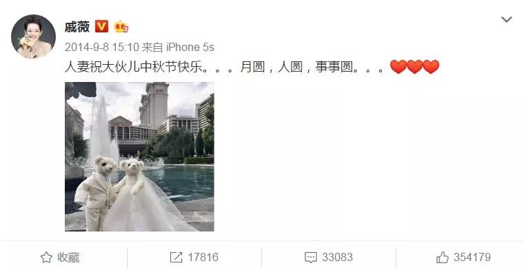 结婚当天,戚薇还不忘在微博上发布喜讯。