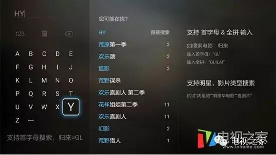 选择乐视网TV版右上角放大镜图案的搜索键,输入《荒原》的拼音首字母“HY”,选择《荒原》第一季,点击试看。