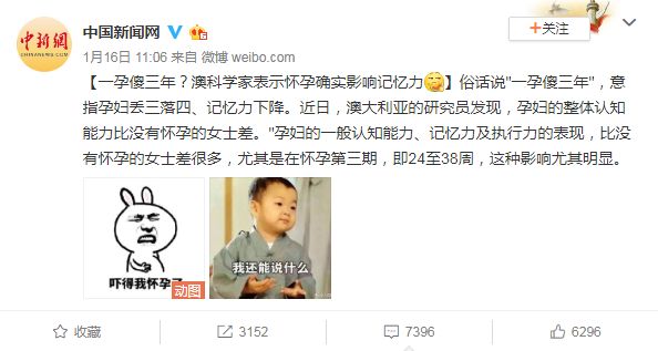 此前,曾有澳大利亚科学家表示,怀孕会影响女人记忆力、认知能力及执行表现。尤其是在怀孕第三期,即24至38周,这种影响尤其明显。