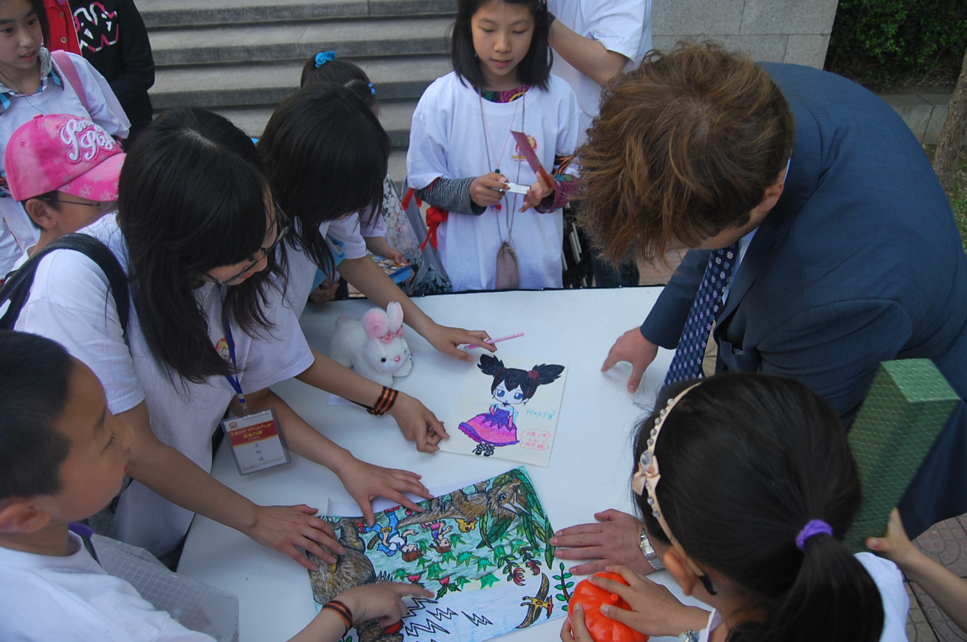 小大使们表演着绘画、书法,引得大使交口称赞,他也加入到我们的艺术创作中来。