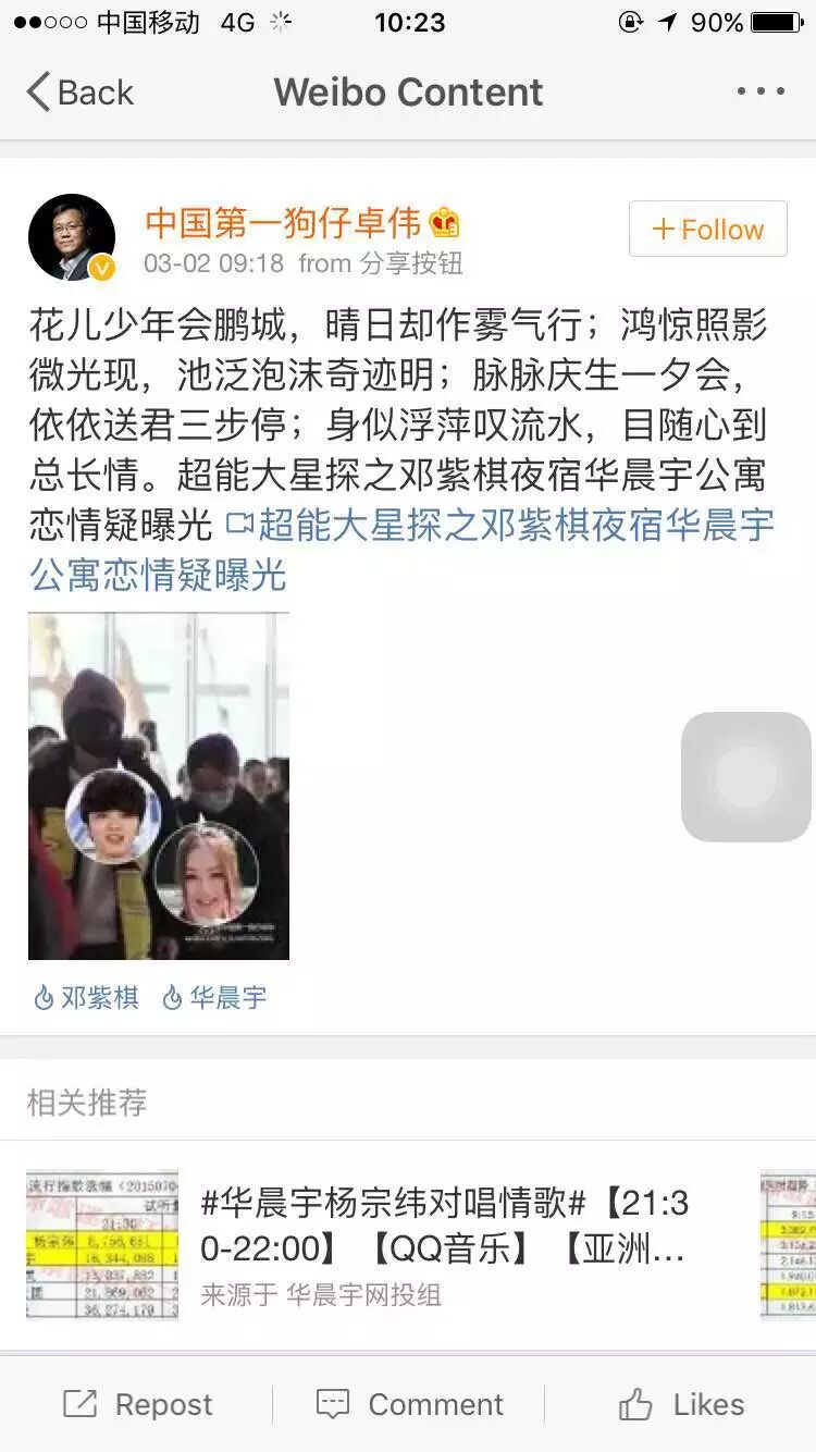 擅长以长焦摄像的卓伟揭开了这段恋情的真面目,拍到了两人除夕同居庆生,还在机场同框的画面。华晨宇和邓紫棋两人的恋情就此坐实。