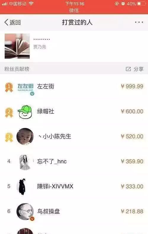 贾乃亮对于妻子李小璐与PG One夜宿事件发长文发声,表明自己对不起家人,希望网友们把这件事交给他自己解决,引来网友的嘘唏,纷纷为其文章点赞和打赏。据网友爆料,网友读完长文对贾乃亮的大气感到佩服,纷纷对文章慷慨打赏,有人前后共打赏2000多元。有趣的是,绿帽社先后共打赏了1201块,感觉十分讽刺。据网友统计这篇长文足足收获了超200万的打赏。
