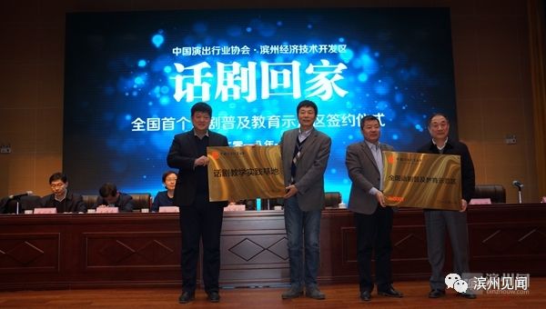 1月16日,话剧回家——全国首个“话剧普及教育示范区”签约仪式在滨州实验中学举行。中国演出行业协会会长朱克宁、中国教育科学研究院体卫艺研究所副研究员许洪帅、中国演出行业协会艺术普及教育委员会主任崔宁、滨州市副市长潘青出席仪式。中国文联副主席、中国剧协主席濮存昕专门为此次签约仪式题字祝贺。市教育局、市文广新局、开发区党工委、开发区教育局负责人以及开发区各中小学教师及学生代表参加仪式。