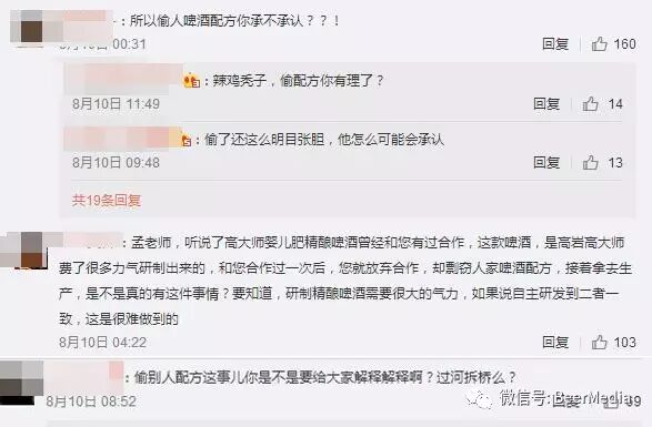 原来看孟非8月7日发布的一条微博下被网友刷屏,指其“偷别人啤酒配方”,“偷别人配方这事儿你是不是要给大家解释解释啊?过河拆桥么?”“孟老师,听说了高大师婴儿肥精酿啤酒曾经和您有过合作,这款啤酒,是高岩高大师费了很多力气研制出来的,和您合作过一次后,您就放弃合作,却剽窃人家啤酒配方,接着拿去生产,是不是真的有这件事情?要知道,研制精酿啤酒需要很大的气力,如果说自主研发到二者一致,这是很难做到的”。(新浪娱乐)