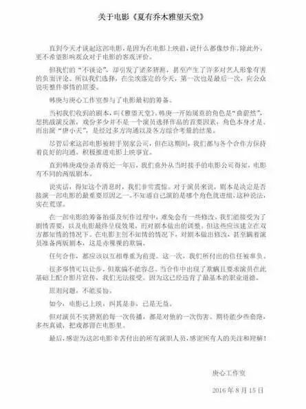 韩庚与吴亦凡争男主?工作室:其实是这样的 八卦女爱临沂 内地男星 2016-08-16 16:30:30 158 创作不易,用心坚持,欢迎请BaGua喝几杯爱心咖啡!打赏并支持本文 打赏并删除本文 电影《夏有乔木雅望天堂》自上映以来,有关韩庚与吴亦凡争男主、不配合宣传等言论就不绝于耳,引发了广泛关注。韩庚工作室发出声明称,他们直到戏份杀青后近一年才知道影片有两个不同版本的剧本,是赤裸裸的欺骗。 这份声明指出:“当初我们收到的剧本,叫《雅望天堂》。韩庚一开始属意的角色是‘曲蔚然’,想挑战演反派,戏份多少并不是一个演员选择作品的首要因素,角色本身才是。而出演‘唐小天’,是经过多方沟通以及各方综合考量的结果。” 但直到韩庚戏份杀青将近一年后,韩庚方才意外从当时接手的电影公司得知:电影有不同的两!版!剧!本! 韩庚方表示,剧本是决定是否接演一部电影的最重要原因之一。在电影主创不知情的情况下,对剧本做出修改,甚至瞒着演员准备两版剧本,这是赤裸裸的欺骗。 创作不易,用心坚持,欢迎请BaGua喝几杯爱心咖啡!打赏并支持本文 打赏并删除本文 感谢您的支持鼓励,我会继续努力的!文章地址:用户邮箱:打赏金额:USDT 请输入数字点击”去打赏“,即可进行打赏支持本文章哦 韩庚 About the Author 八卦女爱临沂 功能介绍:关注临沂圈的那些人和事儿,每天为你献上临沂圈最新鲜消息、八卦、爆料、内幕,给你的生活加点料! Related Posts 韩庚与吴亦凡争男主?工作室:其实是这样的 2016-08-16 16:30:30 发表评论