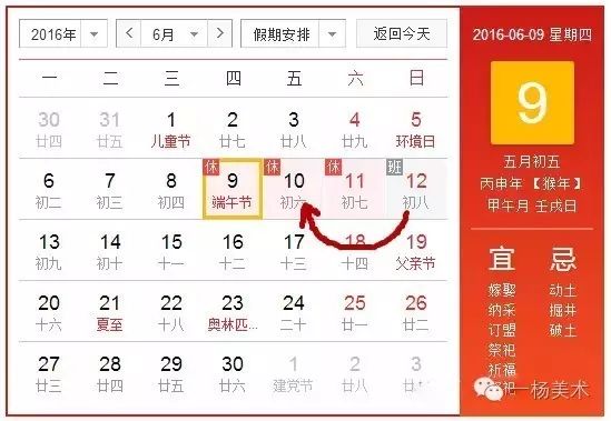 家长,您好。马上就是端午节假日了,端午节期间,杨洋美术周六周日的课程将调整为:周日的课程(6月12号)调到周五(6月10号)上课,周六(6月11号)的课程则按时照常上课。原周五晚上上课的同学可根据自己的时间选择10号或11号的上午来上课!端午假期结束后正常上课。杨洋美术祝您假期愉快哦!