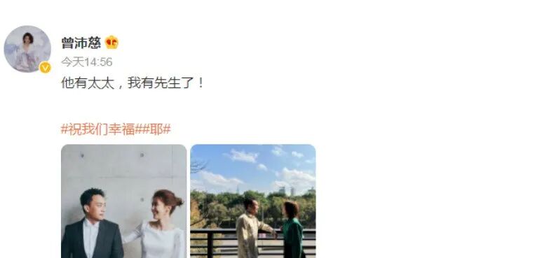 1月16日,女星曾沛慈在社交平台上官宣了自己结婚的消息,配文“他有太太,我有先生了!”并附上两张与丈夫的合照,引来很多网友的祝福。