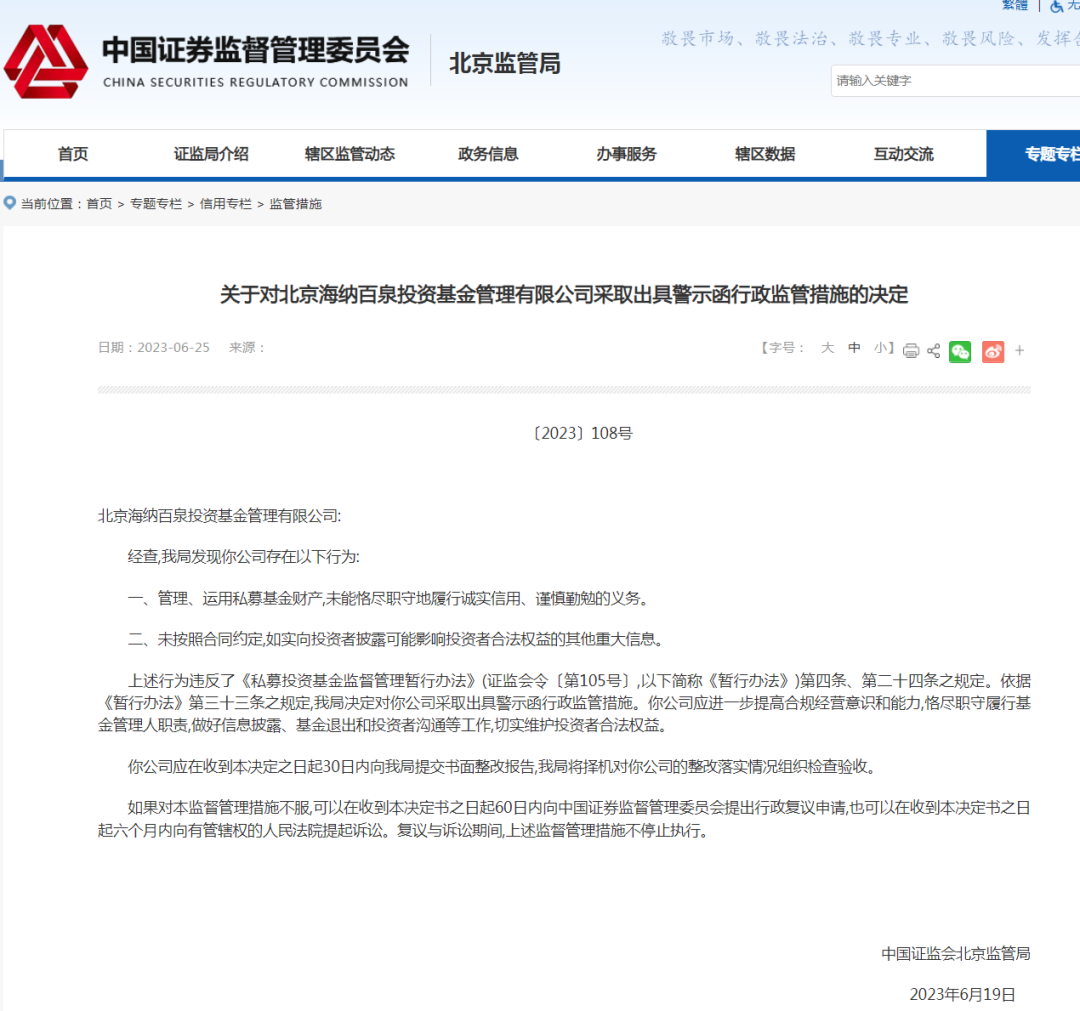 6月28日,北京证监局官网发布关于对北京海纳百泉投资基金管理有限公司采取出具警示函行政监管措施的决定。