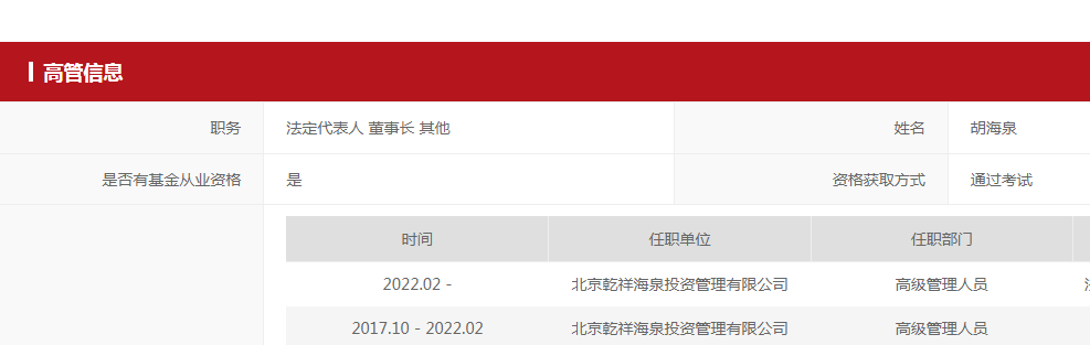 不过据报道,在2022年2月10日,胡海泉退出海泉基金股东行列。海纳百泉基金发生工商变更,胡海泉退出股东行列,新增尹承双为股东。目前,该公司由尹承双、王昱等人共同持股。
