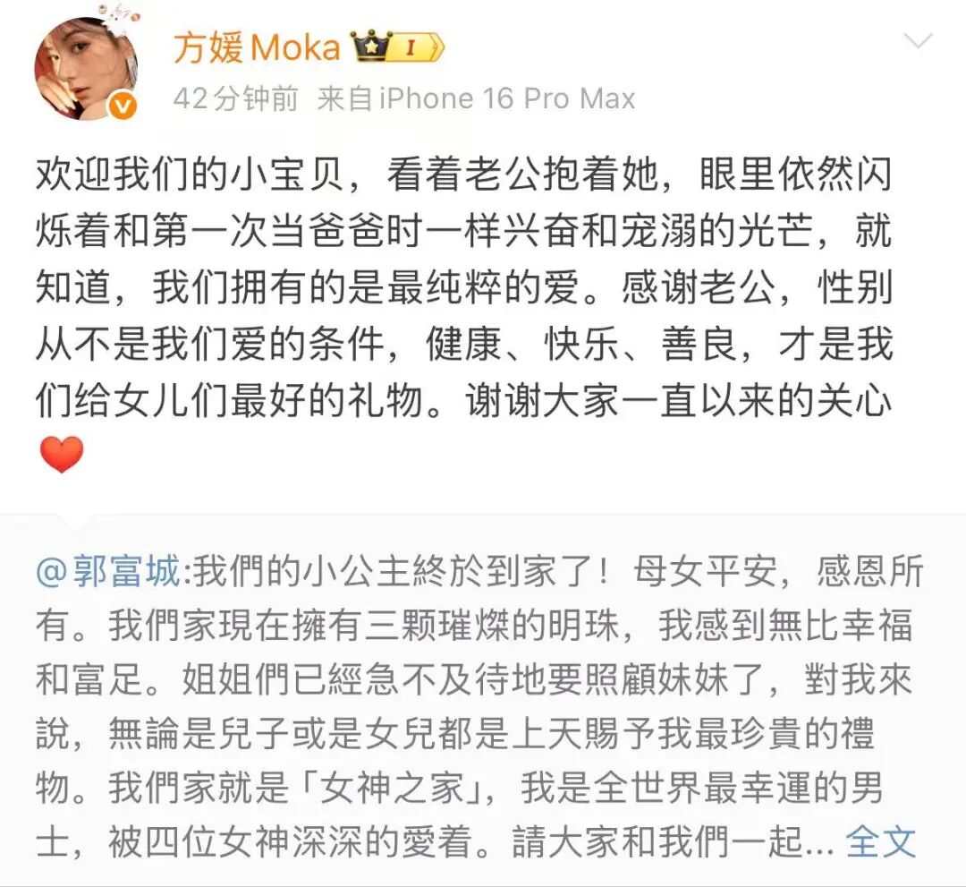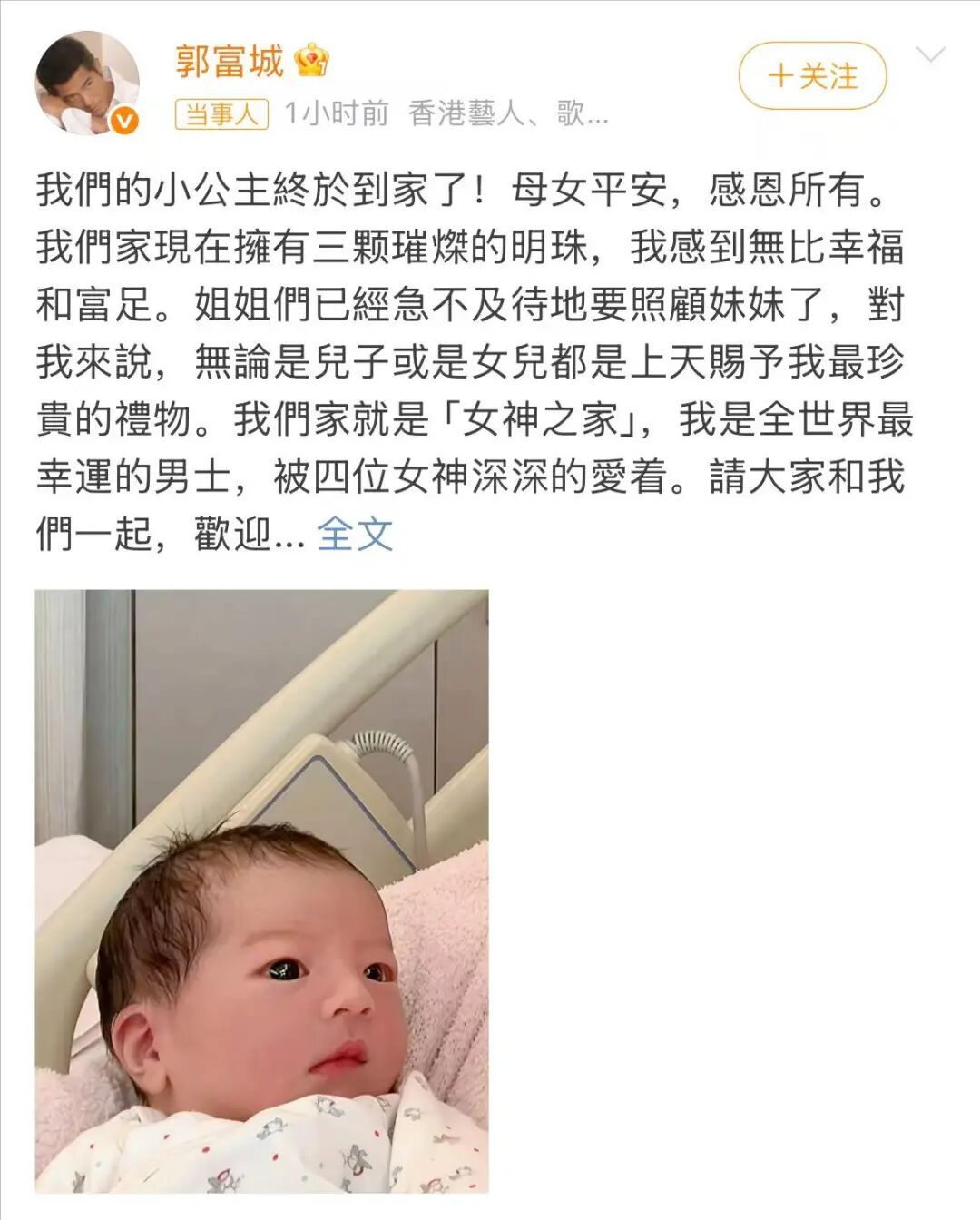 2000万港币的高端月子中心、三胎女儿的诞生、朋友圈刷屏的“女儿奴”——这些,如今被郭富城贴得明明白白。港媒刚曝出他为方媛坐月子一掷千金,紧接着他本人就在社交平台晒出新生小女儿的照片,并配文:“母女平安,感恩所有,我是全世界最幸运的男士,被四位女神深深爱着。”那一瞬间,热搜榜几乎被他和女儿们承包。