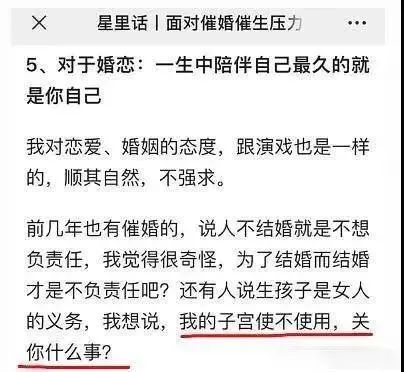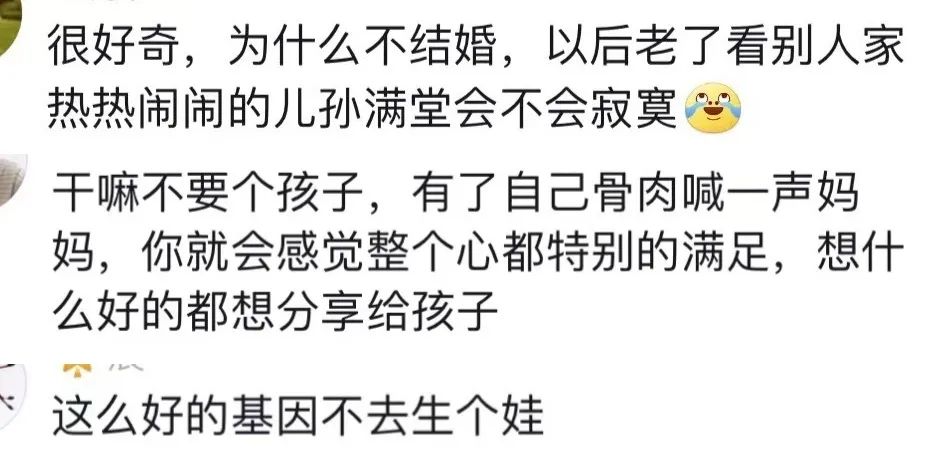 56岁周海媚近况曝光:不婚不育,独自住豪宅,爽到我了! GirlDaily 港台女星 2023-01-22 21:30:24 1044 创作不易,用心坚持,欢迎请BaGua喝几杯爱心咖啡!打赏并支持本文 打赏并删除本文 点击上方卡片关注我吧56岁依然单身的港圈女神周海媚,又被催生孩子了。起因是她发视频分享自己的近况,状态极好,文字也透露出满心欢喜:“我真的好喜欢自己呀,性格不错,长得也可以,有很多人爱我,我也有爱的人……”独住北京豪宅,与猫狗相伴,每天睡到自然醒,四处吃喝玩乐……这本是多少人羡慕不已的生活啊,评论区却出现了一片极不和谐的声音——你为什么不结婚?为什么不生娃?有人以高高在上的姿态,搬出“养儿防老”的老一套洗脑话术。还有人妄加臆断:不是她不想生孩子,而是生不了。但望周知,周海媚患过红斑狼疮,却不是遗传病,调理好后也不影响生育。仅仅因为一个女明星选择不婚不育,就不怀好意地对她的生活指手画脚。Gigi看这些多管闲事的人,才是真的有病。只想把姐姐的精彩回怼,送给他们:美女的人生,你们管不着!事实上,这并非周海媚第一次面对类似的劝生言论。网友要么旁敲侧击,向她灌输生孩子的意义:“女神还好美,可有孩子的人生会更完整。”“你这么好的颜值,不留给后代多遗憾啊。”谢谢您嘞,姐姐活得清醒而通透:我家又没有王位去继承。要么看不惯她单身的活法,直接开杠:“(会养狗)这么有爱,为什么不生个孩子?”可姐姐只爱养狗,不想养孩子,又与你何干?为人妻母固然是一种幸福,但绝不是女性唯一的选择。有人天生爱孩子,只想琴瑟和鸣享受一家人齐齐整整的天伦之乐;有人生性爱自由,就想策马奔腾追求诗和远方,天大地大不如我最大。周海媚,无疑属于后者。她年轻时,也曾和吕良伟有过短暂的婚姻。两人因戏生情,爱得真挚热诚,偷偷跑去美国结婚。结婚时,彼此都心怀白头偕老的念头,只是婚后真正生活在一起,才发现双方不合适。吕良伟家风传统,连早餐也要求全家人一起吃,更希望妻子相夫教子,照顾病父。周海媚从小随性率直,爱睡懒觉,不懂得照顾人,更不愿为家庭放弃如日中天的事业。本来两人因相爱而结婚,可如果连做自己的快乐都没有了,倒不如不爱。周海媚果断挥手说拜拜,结束8个月的婚姻。遇到迪生集团董事长伍士荣后,姐姐又轰轰烈烈谈起恋爱。只是突如其来的一场大病,让她认清对方的凉薄,也明白——遇到完美契合的另一半容易,但要做到两个人一直相爱,实属不易。哪怕两段感情都失败告终,周海媚遇到喜欢的人,照样勇敢爱,毫不含糊。恋上小7岁的北京建筑师,她为了解决异地恋问题,毅然从香港搬到北京,买房定居。家人朋友不祝福?姐还是那副“我高兴就行,才不管你们”的态度。又酷又傲!男方渴望稳定成家,见识过婚姻生活一地鸡毛的周海媚,却只想自由相恋。对她而言,爱情并非需要一纸婚书来证明,就算要生小孩,也不一定要结婚。两人终因观念不合,和平分手。随性活了半生,尝尽爱情的甜与苦。周海媚更清晰地认清,自己想过的生活——“结婚生子,看似每个人生命中必经的过程,但不是唯一的选择。婚姻不是我的归宿,我只想向前奔跑。”她住在自己买来的房子里,与狗狗嬉戏打闹。打理着院子里的瓜果菜花,嘴角眉梢都是止不住的笑意。原来只要把自己活好,一个人也可以很开心,爱情婚姻孩子都并非人生必需品。听到有女生烦恼自己31岁了,经常被催婚,感觉很痛苦。周海媚回答:“我54岁了也没结婚,难道我不活啦?就算不结婚,我也活得可高兴了。”她温柔告诉所有女孩子,学会喜欢自己,不要活在别人的嘴巴里。不必恐惧爱情变质,不必斡旋婆媳关系;不必担心生育带来的身材变样,更不必为孩子牺牲自己……那些始终把女性价值困在“生儿育女”牢笼里的人,又怎会明白周海媚的单身快乐?可无论女明星们过得多幸福,只要到了一定年纪还单身,总会遭到各种指指点点。仿佛她们不结婚不生小孩,就是莫大的罪过。小到传宗接代,大到社会发展,什么问题都能往女性生育上甩锅。甭管这些人自身婚姻是否幸福,是否生过孩子,总能找到各种说辞“美化”婚育——“月经不调肚子痛?生个孩子就好了。”“夫妻感情差?有婆媳矛盾?生个孩子吧。”他们闭口不谈生育的痛苦和危害,只知道一股脑把生子意愿强塞在女明星头上,好笑至极。大清都灭亡多少年了,依然有人以裹小脚思想为荣,把女性物化成生子机器:“给你(生孩子的)功能,干嘛不用呢?”可生育只是生命赋予女性的一项权利,而不是必须履行的义务。正如马伊琍所言,卵子的最终使命也不是成为一颗受精卵,它亦可以只当一颗卵子。女性并非为了当母亲而活,她最大的价值应该是做好自己。对于“生孩子是女人的义务”的说辞,Gigi多希望女孩子们都能像秦岚一样霸气回击:我的子宫使不使用,关你什么事?43岁的秦岚并非拒绝结婚生子,而是认为一切都要顺其自然。过去与导演陆川恋爱,她多次拒绝对方求婚,就是因为没有做好准备,不想为了结婚而结婚。姐姐清醒得很,婚姻能为自己带来幸福感才值得去争取,否则就是形式化的枷锁。如果两个人没那么相爱,何必把婚姻的枷锁,强行扣在自己头上,让彼此都不舒服?上个月,单身许久的秦岚被拍到与小10岁的魏大勋在三亚约会。和弟弟挽手的她活蹦乱跳,戴着口罩都能感受到欢欣幸福。可见结婚与否,影响不了姐姐的快乐。还