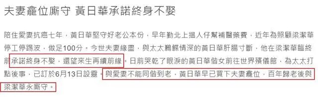 目前,根据港媒最新报道显示,早已哭干眼泪的黄日华,在接受采访时,也透露了自己在爱妻梁洁华离世的最后一刻,对她承诺自己将会终身不娶,希望两人来世再续情缘,此外,黄日华也表示自己早已买下夫妻龛位(墓碑),将在百年后与梁洁华合葬在一起。