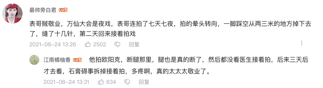 “我记得当时有一场哭戏,想着到我施展演技的时候了,坐那就开始哭。当时李雪健老师就让导演叫停,说‘你现在还是修庆,不是花荣。一代名将,含着就足够了。’点石成金!当时我一下明白,表演是要生动的刻画人物角色,万万不能重演技而轻人物,失去自己对于人物的理解。”