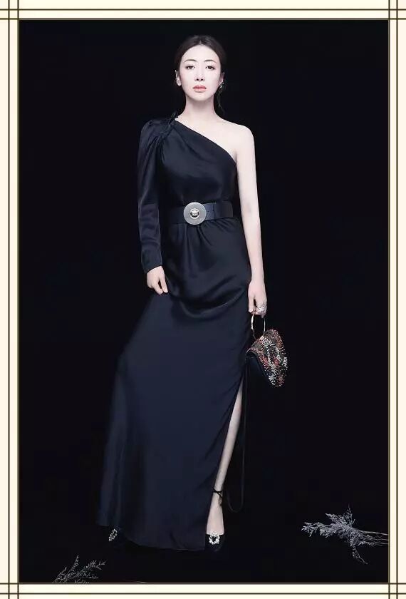 一袭黑色的连衣长裙精致独特,露单肩的设计十分的性感,垫肩的设计充满复古的情怀。高开叉的设计尽显美腿呢,腰间加上黑色的腰带设计更好的修饰身材。