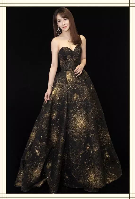 一袭黑色的连衣长裙抹胸的设计更加的性感一些,裙子上面机上金色的图案修饰像是被施了魔法一般,梦幻而又精致不已,配上棕色的长发瞬间充满女人味儿。