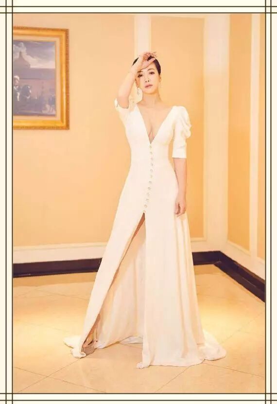 一袭白色的连衣长裙十分的大气优雅,而且深V领的设计更加的性感一些,而且小巧的纽扣设计更显精致,高开叉的裙摆更是气场满分,帅气满分。